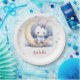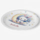 Super cute paper plate featuring a cute white little bunny wearing a beautiful purple bow sitting on a yellow moon with some gold falling stars.