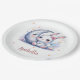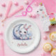 Super cute paper plate featuring a cute white little bunny wearing a beautiful pink bow sitting in front of a lovely moon with some gold falling stars.