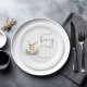 Cute paper plates for your baby shower featuring "A Sweet Little Bunny Is On His Way" written in a mixture of dusty olive green typography and stylish script, and a watercolor bouquet of a pastel blue pumpkin, orange florals and greenery. Personalise with the mother's name in simple modern dusty olive green typography.