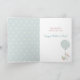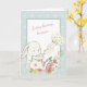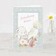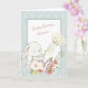 On the front of this adorable Mother's Day card is a little white bunny dressed in a pink flower suit and holding dainty white flowers. The bunny sits in the middle of a pastel pink and yellow bouquet of flowers. The image is framed with a blue and cream pattern, and the center has soft pink script that says "Every bunny knows..." The inside continues the thought "I have the best Mama in the world", but you may easily change it to something else, if you'd like. There's another image of the bunny with a balloon at the bottom.