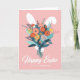 Cute Easter greeting card featuring a white bunny holding a bouquet of colourful spring flowers. "Happy Easter" is displayed in bold script lettering with your name shown below. Personalise the inside of the adorable Easter card by adding your typed or handwritten message. The back of the card features a matching floral pattern.