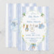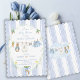 This cute baby bunny clothesline theme features a custom hand-painted frame of a crisp blue vertical stripe pattern accented with a lush greenery wreath, creating a clean, classic, and welcoming look. A sweet watercolor clothesline is strung across the center, proudly displaying tiny, adorable items, each featuring a cute bunny dressed in blue. The scene is completed with a darling blue bow holding a bunch of fresh carrots, and bright, cheerful daffodils, all rendered in a soft watercolor style. Easily add your own details and change the font style, size color and placement if you would like to.