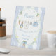The Favor Pedestal Sign features a custom hand-painted frame of a crisp blue vertical stripe pattern accented with a lush greenery wreath, creating a clean, classic, and welcoming look. A sweet watercolor clothesline is strung across the center, proudly displaying tiny, adorable items, each featuring a cute bunny dressed in blue. The scene is completed with a darling blue bow holding a bunch of fresh carrots, and bright, cheerful daffodils, all rendered in a soft watercolor style. Easily add your own details and change the font style, size color and placement if you would like to.