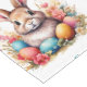 Cute Bunny Colourful Eggs Flowers Happy Easter Holiday Tablecloth. A pastel-coloured Easter greeting table cloth featuring a cute bunny illustration surrounded by decorated eggs and flowers. The bunny has a soft, watercolor-style appearance with a friendly, smiling face.