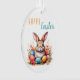 Cute Bunny Colourful Eggs Flowers Happy Easter Photo Ornament. A pastel-coloured Easter decor featuring a cute bunny illustration surrounded by decorated eggs and flowers. The bunny has a soft, watercolor-style appearance with a friendly, smiling face. On the backside is a custom photo and family name.