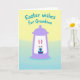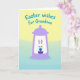 This design shows a lavender lantern-like shape centered on the card, holding a small white bunny with long ears tipped in soft pink 🐰. The bunny’s wide, gentle eyes and slight blush give it a tender, friendly look as it hugs a striped oval egg close to its chest, as if sharing a quiet moment with someone special. The egg features alternating bands of deep purple and bright teal, adding a cheerful seasonal touch. Behind the lantern, the background fades from pale yellow at the top into a calm blue‑green near the bottom, like early spring light. Near the top, the greeting text sits above the illustration in rounded cyan lettering, easy to spot against the lighter sky. Smooth outlines and pastel tones keep everything soft and calm, with a few small curved accents around the bunny’s paws that suggest a gentle squeeze 🐇. The lavender frame has rounded corners and a small loop detail at the top, like a hanging lantern.