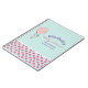 A personalised spiral notebook for a shower or birthday. Designed with a whimsical white bunny holding a big pink balloon floating up in the air. Pink polka dot circles create a cute and charming border. Set on a light blue-green background.