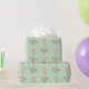 Wrapping paper with a whimsical white bunny holding a big pink balloon floating up in the air. A fancy banner with a little blue bird says "Happy Birthday. Set on a light green background.