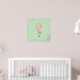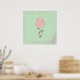 A poster with a whimsical bunny holding a big pink balloon floating up in the air. Set on a light green background.