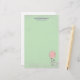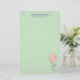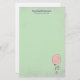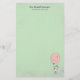 Stationery with a whimsical bunny holding a big pink balloon floating up in the air. Set on a light green background.