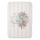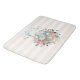 A cute bath mat. Peach and white striped pattern. A digital illustration made with watercolors. A charming bunny rabbit wearing a blue dress sitting in a basket surrounded by her eggs. Butterflies flutter around the basket which is decorated with a fancy flower bouquet.