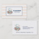 Professional business cardss with a peach striped background and a frame layered over top. Designed with an illustration created with watercolors. A cute bunny rabbit wearing a blue dress sitting in a basket surrounded by her eggs. Butterflies flutter around the basket which is decorated with a fancy flower bouquet.