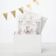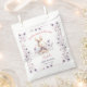 Girl Baby Shower Favour Bags featuring an adorable baby bunny girl in soft purple flowers and pink & purple text on the white background. These Favour Bags are perfect for a charming spring-themed girl baby shower. Easily personalise the text - Kate Eden Art