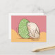 Adorable bunny pushing a green decorated egg. Background is pink and orange. Fun for Easter, Ostara, and spring festival. Text is customisable.