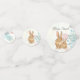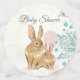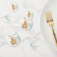 The spring time baby shower table confetti features a mum and baby bunny rabbit. They are sitting among soft early spring coloured flowers.