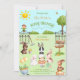 A rabbit themed kid's Birthday invitation. The watercolor children's invite features cute bunny rabbits enjoying a Birthday party in a sunny garden, surrounded by carrot cake, a scarecrow and gardening equipment.