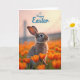 This card shows a small bunny 🐰 with soft gray-brown fur sitting slightly off-center in a field of orange blossoms, as if pausing to admire someone just out of view. Its head tilts up and to the right, and the glossy dark eye catches the light in a way that feels like a tender, attentive glance. Fine whiskers spread from a rosy nose, and the upright ears show a gentle pink inside that warms the face. The flowers around it blur into layers of deep tangerine and soft apricot, making the bunny feel close, like a quiet companion in the foreground. Across the top, a seasonal greeting is placed in flowing blue lettering, floating against a sky that fades from pale peach into a soft blue. The background stays dreamy and out of focus, with a faint, distant building shape on the horizon that adds depth without stealing attention. 🌷 The scene is framed by sunlit petals that melt into a soft haze, with the blue text hovering above the bunny’s raised gaze.