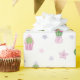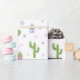 This cactus wrapping paper with illustrations of prickly pear cactus, baby cacti in pots, boots, muffin cups, and star-shaped flowers on a white background is perfect to wrap gifts for Baby Shower, birthday and other occasions.