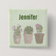 Birthday girl button with a whimsical design. 3 cute cactus all in a row with smiling faces sitting in a flowerpot each wearing some jewellery.