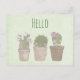 A hello postcard with a whimsical design. 3 cute cactus all in a row with smiling faces sitting in a flowerpot each wearing some jewellery.