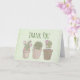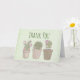 Thank you card with a whimsical design. 3 cute cactus all in a row with smiling faces sitting in a flowerpot each wearing some jewellery.