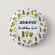 Birthday girl button with a cute and fun pattern. Illustrations of different cactus, sitting in flower pots with cartoony happy smiling faces.