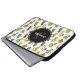 Personalised laptop sleeve with a cute and fun pattern. Illustrations of different cactus, sitting in flower pots with cartoony happy smiling faces. A black circle layered over top with your name and initial inside.