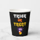 These cute halloween party paper cups feature a black background with a cute spider holding a piece of candy corn and the greeting "Trick or treat". You can also customise this design by adding your own text. See our Halloween collection for the coordinating invitation!
