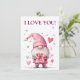 cute card with a cartoon pink gnome in love with a heart for the holiday in February on Valentine's Day