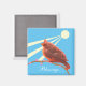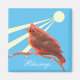 Cute cardinal bird magnet. Little bird standing on a blooming tree branch under the sun rays on a light blue background. Text can be personalised.