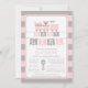 Modern Train baby shower invitation featuring a cute train with a pink teddy bear, baby bottle and gift set on a pink & light grey brown stripe background with an rattle accent and pendant banners. Flip our girls baby shower invite over to view a matching back for an extra special touch. Perfect for a train themed little baby girl shower.