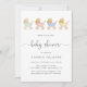 This cute and minimal gender-neutral baby shower invitation features a parade of pastel mint green, blue, pink, yellow and gold retro baby carriage watercolors and "baby shower" written in a stylish contemporary script. You can easily personalise the shower details.