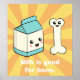 A cute cartoon of a milk carton and a bone with kawaii expressions on a orange and yellow background. Caption reads "Milk is good for bone." Encourage kids to get calcium for their bones. Ideal as a kindergarten school poster. Design by Rusty Doodle.