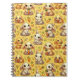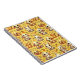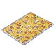 Colourful and whimsical pattern featuring cute, cartoon-style rabbits. The rabbits are depicted in various poses, some sitting and others holding or near carrots. The background is a cheerful yellow, accentuated by small flowers and green foliage