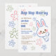 Hop, Hop, Hooray! Your little bunny is turning ONE! This adorable birthday invitation features a playful cartoon bunny peeking from the corner, surrounded by twinkling funny stars on a soft pastel background. With a fun mix of script and serif fonts, the text reads, “Our little bunny [Name] is turning one!”—making it the perfect way to celebrate this special milestone. The back continues the whimsical theme with a sprinkle of cheerful stars. Easily customise all the party details for a truly personal touch!