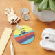 Cute cartoon character kids keychain with a funny creature with sharp teeth biting on colourful stripes in blue, purple and red colours against light yellow background and customisable name. Fun and whimsical personalised design for cheering up yourself and everyone you meet.