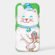 Vintage illustration Christmas holiday design featuring a cute white cat wearing a Santa hat and blue bell. This adorable furry feline is holding a Christmas present and has a striped heart hanging from her tail. Stars sparkle on the green background.