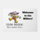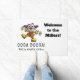 Cute Cartoon Clown. Not scary. Arms outstretched. "Ooga Booga! in modern black font with "Well...maybe not" underneath. There is a message to the right that you can change to customise (Welcome to the Millers!)