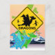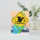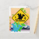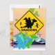 Cute Cartoon Dragons with Beware of Dragons Sign Postcard. Cute green and blue cartoon dragon with colour star wings and big star tail and yellow black warning traffic sign with dragons in a dragon fantasy world with snowy mountains and castle postcard. This colourful cute cartoon dragons postcard is fully customisable, add your text(s) and images!
