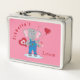A cute pink and white lunchbox for kids with a cute cartoon elephant holding flower and surrounded by some red and pink hearts .