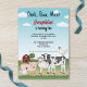 Destei's original cartoon illustration of cute farm animals including a black and white cow, a pink pig, a sheep and two chickens. On the back there is a red barn on green grassy hills together with a tree and some hay. The sky is blue with some clouds. One of the chickens is placed on top of the cow. Personalise the sample text areas with the details of your party.