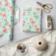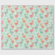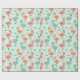 This wrapping paper features pink, teal, and peach cartoon flamingos standing, decorated with pastel hearts, clouds, and stars on a mint green background.