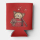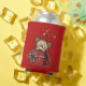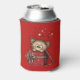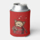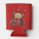 A can cooler with a cute drawing of a little kitten poking its head out of a gift box.