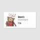 A name tag with a cute drawing of a little kitten poking its head out of a gift box.