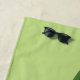 This beach towel features Destei's cartoon illustration of a red ladybug with black dots on a big green leaf. On the bottom there is a green stripe with a personalizable text area for a name. The background colour is light green.