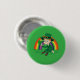 Button with an Illustration of a cute smiling leprechaun wearing a green suit, a top hat while holding a shamrock leaf, with a colourful rainbow in the background