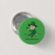 Button with an Illustration of a cute smiling leprechaun wearing a green suit, a top hat while holding a shamrock leaf