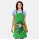 Apron with an Illustration of a cute smiling leprechaun wearing a green suit, a top hat while holding a shamrock leaf, with a colourful rainbow in the background