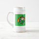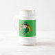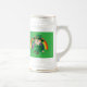 Beer Stein with an Illustration of a cute smiling leprechaun wearing a green suit, a top hat while holding a shamrock leaf, with a colourful rainbow in the background