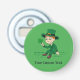 Button Bottle Opener with an Illustration of a cute smiling leprechaun wearing a green suit, a top hat while holding a shamrock leaf